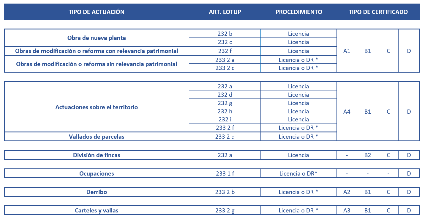 ECUV EQA puede intervenir en los procedimientos relativos a las actuaciones urbanísticas previstas en los artículos 232 y 233 del Texto Refundido de la Ley de Ordenación del Territorio, Urbanismo y Paisaje, de la Comunitat Valenciana aprobado por el Decreto Legislativo 1/2021. Cada tipo de actuación requiere unos tipos de certificados: