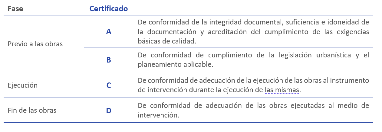 Según el Decreto 62/2020, de 15 de mayo, por el que se regulan las funciones de las ECUV, las Entidades Colaboradoras formalizarán sus actuaciones en un certificado en el que se hará constar el resultado de su actuación. Dichos certificados son los que acompañarán a la solicitud de lic_cia o a la declaración responsable, pudiendo emitir 4 tipos de certificado dependiendo de la fase y la actuación, con una aplicación directa en todo el territorio de la Comunitat Valenciana.